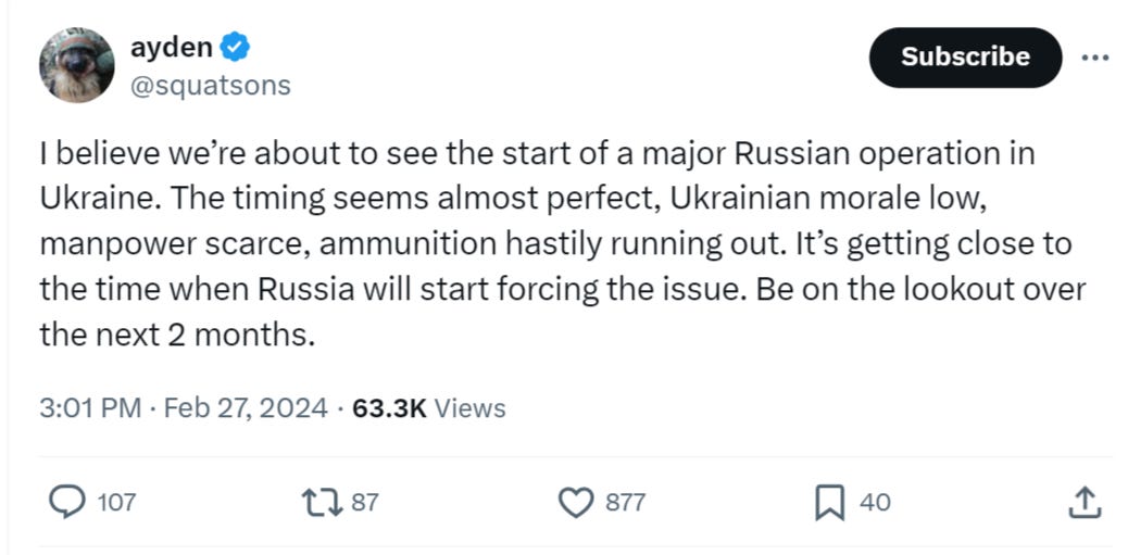What makes most sense with this line of reasoning is that Russia may strategically time a larger operation to coincide precisely with the political meltdown coming in May, which we spoke of at the start of this article. Suppose that May comes around and Zelensky is drowning amid a court whose ‘knives are out’ against him. The AFU situation is catastrophic with no aid nor ammo, and suddenly an even larger, perhaps unprecedented, Russian operation begins. What would the optics and fallout of that be? It could very well be the final push that collapses Ukraine’s political system, or even the AFU itself.