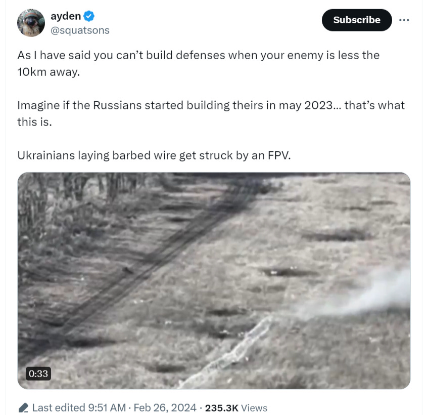 This was corroborated by a new video showing Ukrainian troops attempting to fasten an ad hoc barb wire fence not far from the frontline, and getting liquidated by Russian FPV drones: