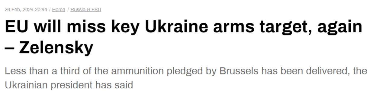 I should mention here that it’s also been revealed that Europe is going to deliver even less ammo than they had ‘revised’ their promise to. You’ll recall it was supposed to have been 1M total shells, which got changed to around 500k. Now it’s being said that only 300k will have been delivered when all is said and done—a fact I pretty much predicted as I was skeptical of Josep Borrell and co.’s boastful promises.