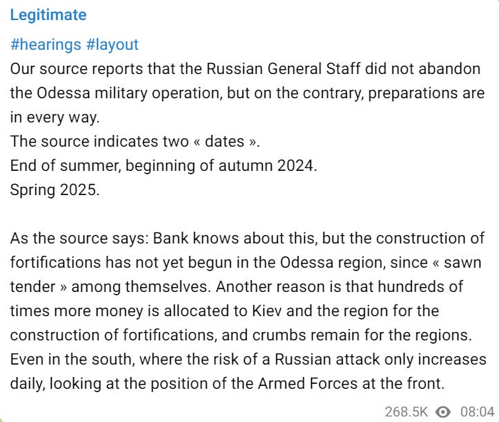 Legitimate channel, which has proven fairly accurate with their various sources and ‘rumors’ over the course of the SMO, even says that Russia is planning an Odessa operation for later this year: