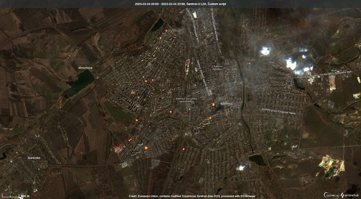 The question is, can Bakhmut even hold out until mid-April? For now, it looks like it might, considering that Wagner forces have lost a little steam there this week, given that the AFU has poured in some of the reserves meant for the ‘counter-offensive’ to shore up defenses. Here are a few interesting maps:
