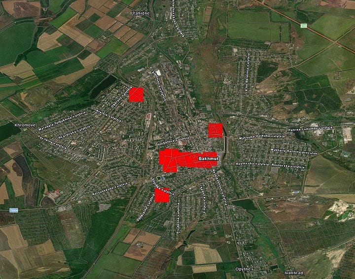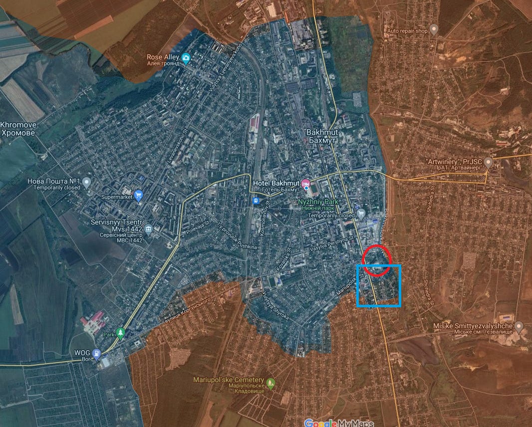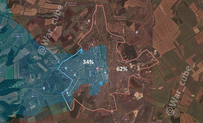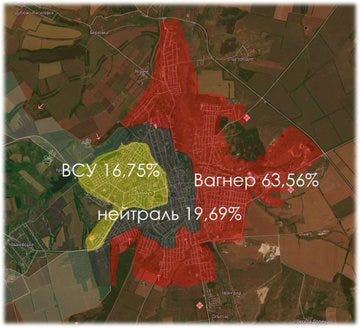 This is a map showing percentages of areas held, with the claim that Wagner holds nearly 64% of Bakhmut, Ukraine 17%, and 20% is ‘neutral’ gray-zone or no man’s land through which the shooting is taking place, but where neither side is stationing active troops or positions. Though another map has it like so, giving the neutral areas to Ukraine: