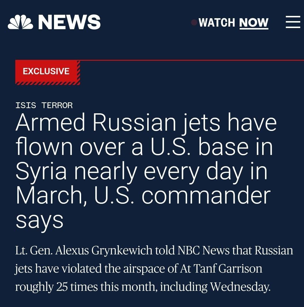 On the other hand, Russia continues to respond asymmetrically to these provocations. In March, the US claims that Russia ‘violated their airspace’ by directly overflying US bases in Syria on almost every single day of the month: