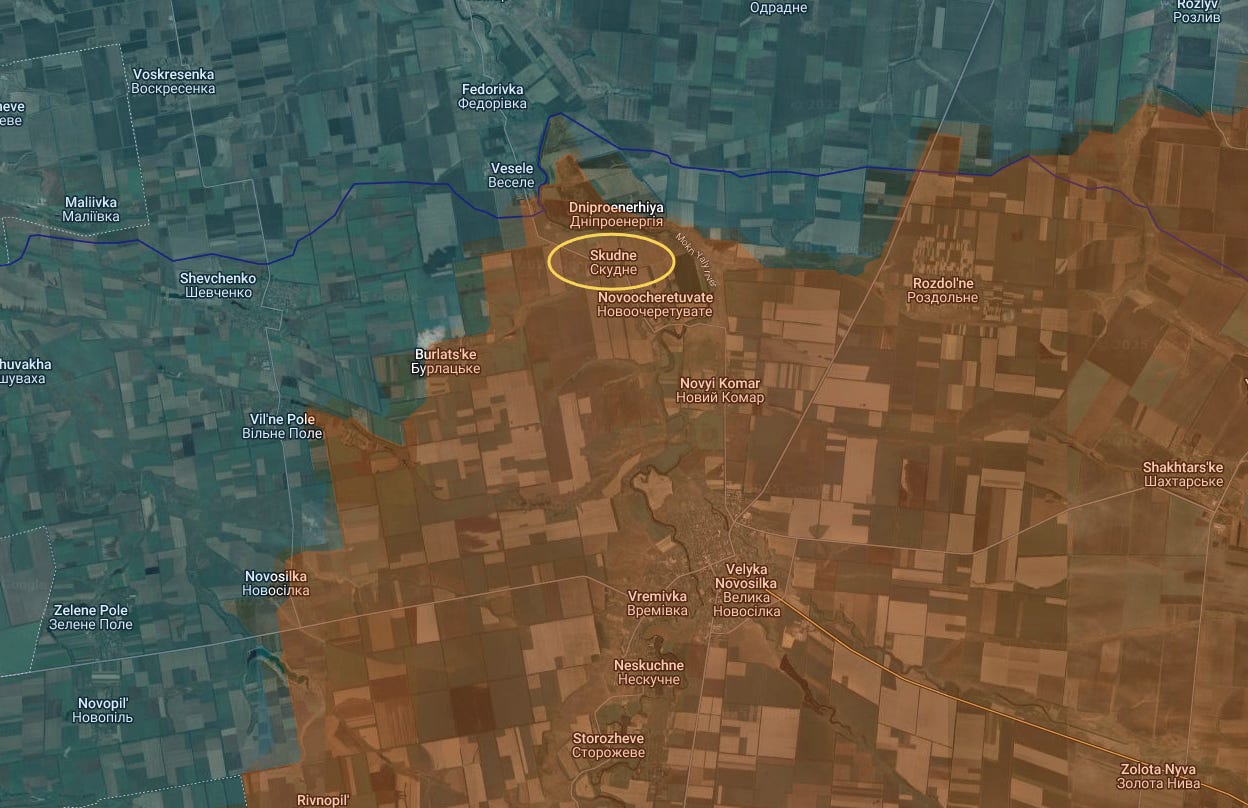 Russian forces have pushed along virtually every other front. In the Pokrovsk direction they have expanded control in the south and west directions. Most notable has been on the Velyka Novosilka direction, where they have continued pushing northward along the Mokry Yaly river. You may recall Novy Komar was just captured a couple months ago, with Skudne several weeks ago: