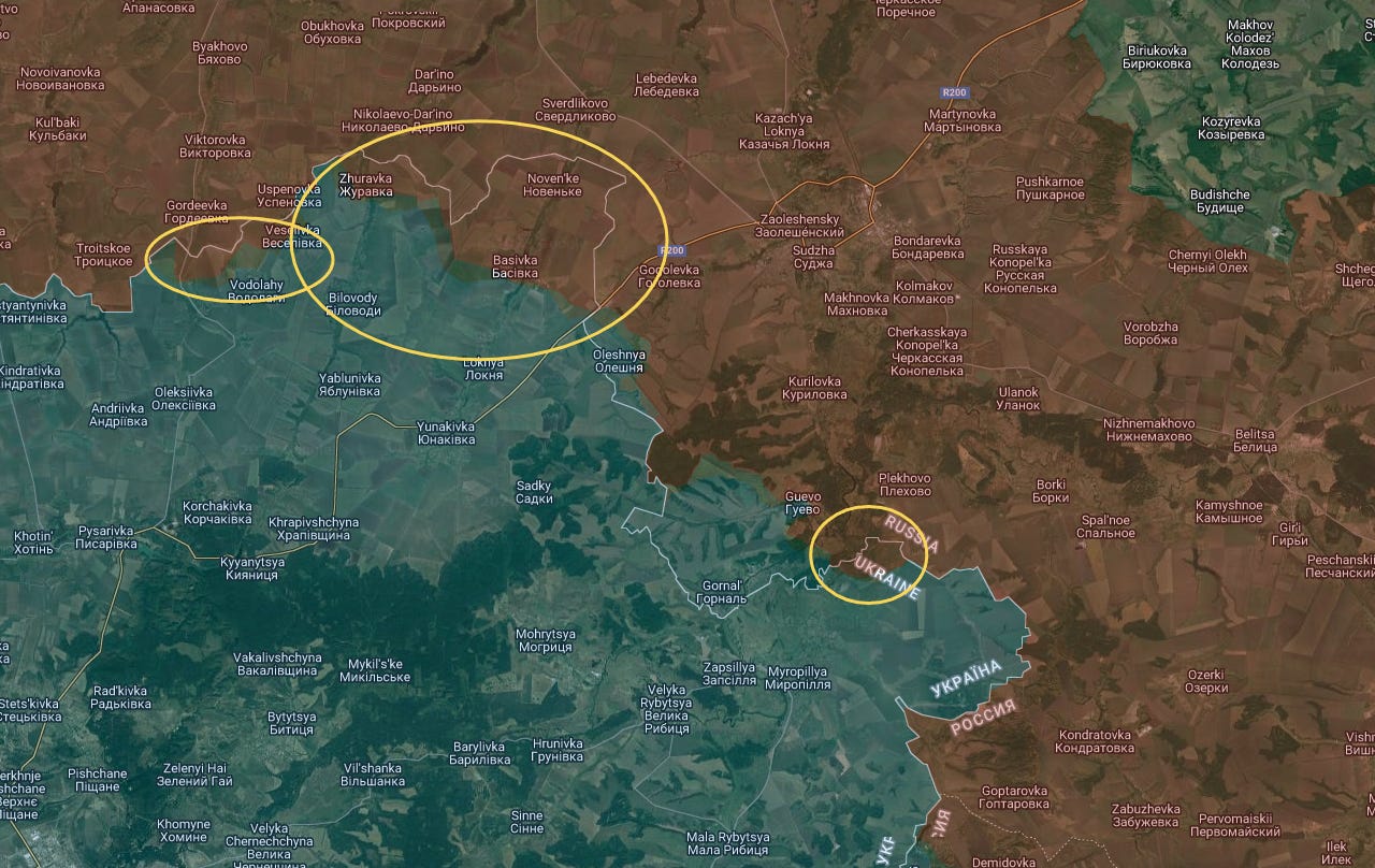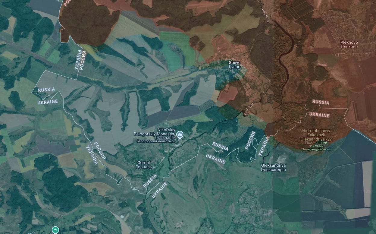 You can see there’s only a small tract of land south of the crossing that remains in Ukraine’s hands, though in the second area, Ukraine still holds a tiny portion of Guevo, though some sources have claimed Russia had finished capturing it: