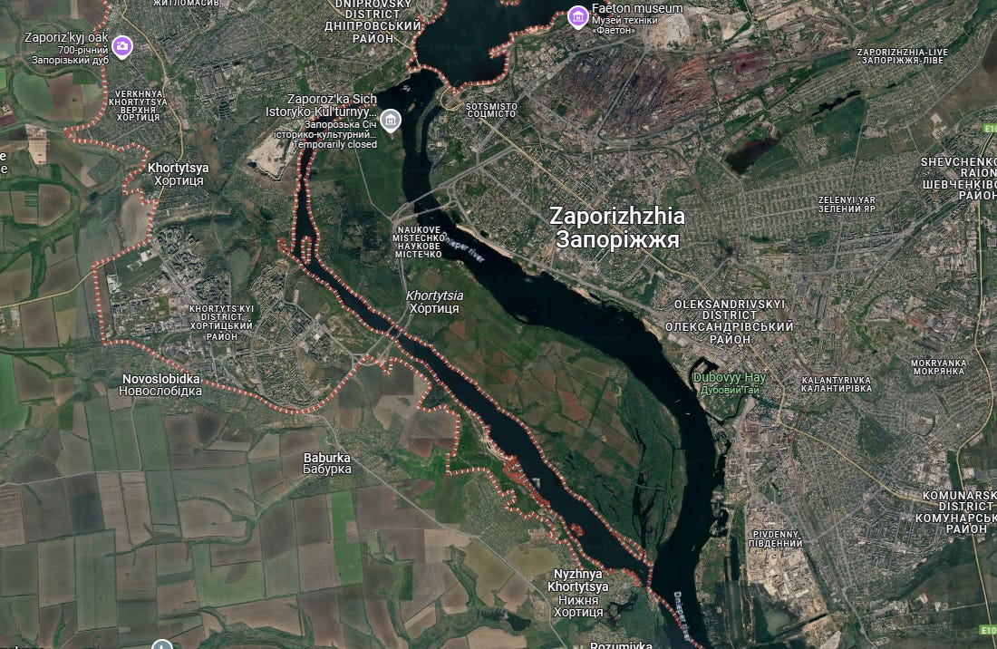 We discussed here long ago that a potential Russian plan for crossing the Dnieper could include first capturing Zaporozhye city, which would allow maintaining a secure bridgehead whether the AFU blows the main Zaporozhye bridges or not. That’s because Zaporozhye has the large Khortytsia isle which spans across the river, that would likely allow much easier pontooning and building of temporary bridge structures than elsewhere on the river.