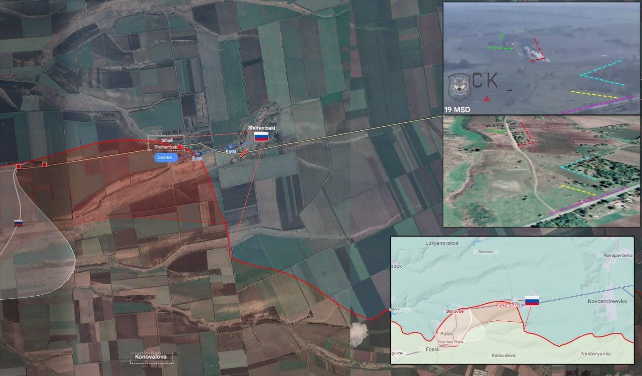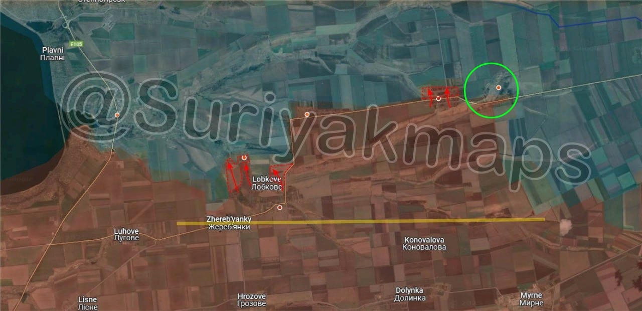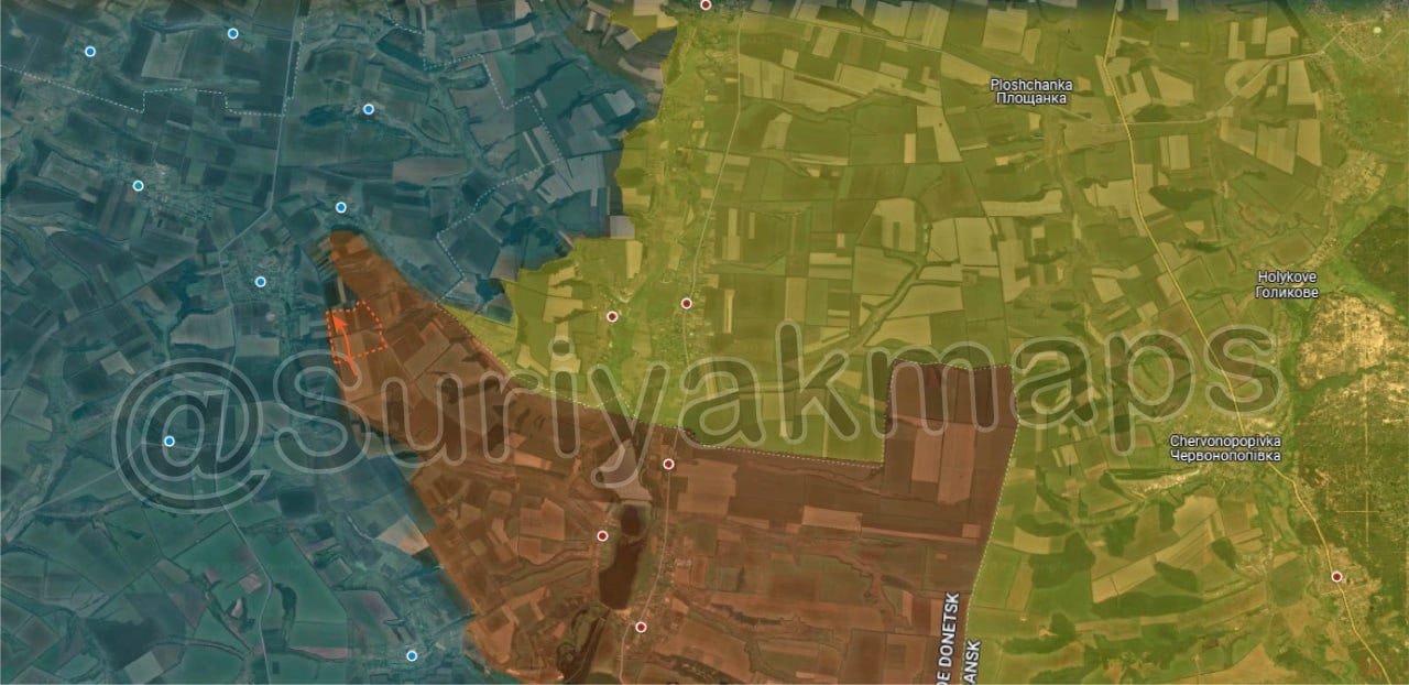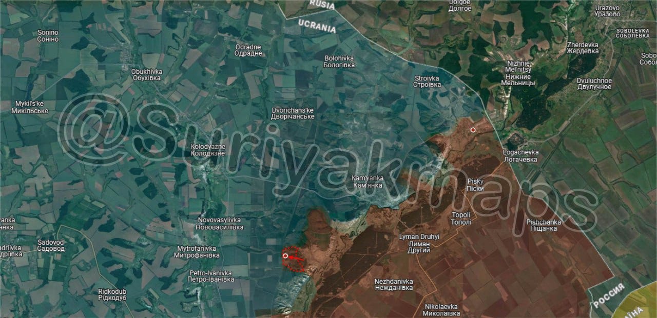 Russia has recently restarted offensives in this direction, making some of the largest gains of the past weeks of any front. Using Suriyak’s map, we can see the following: