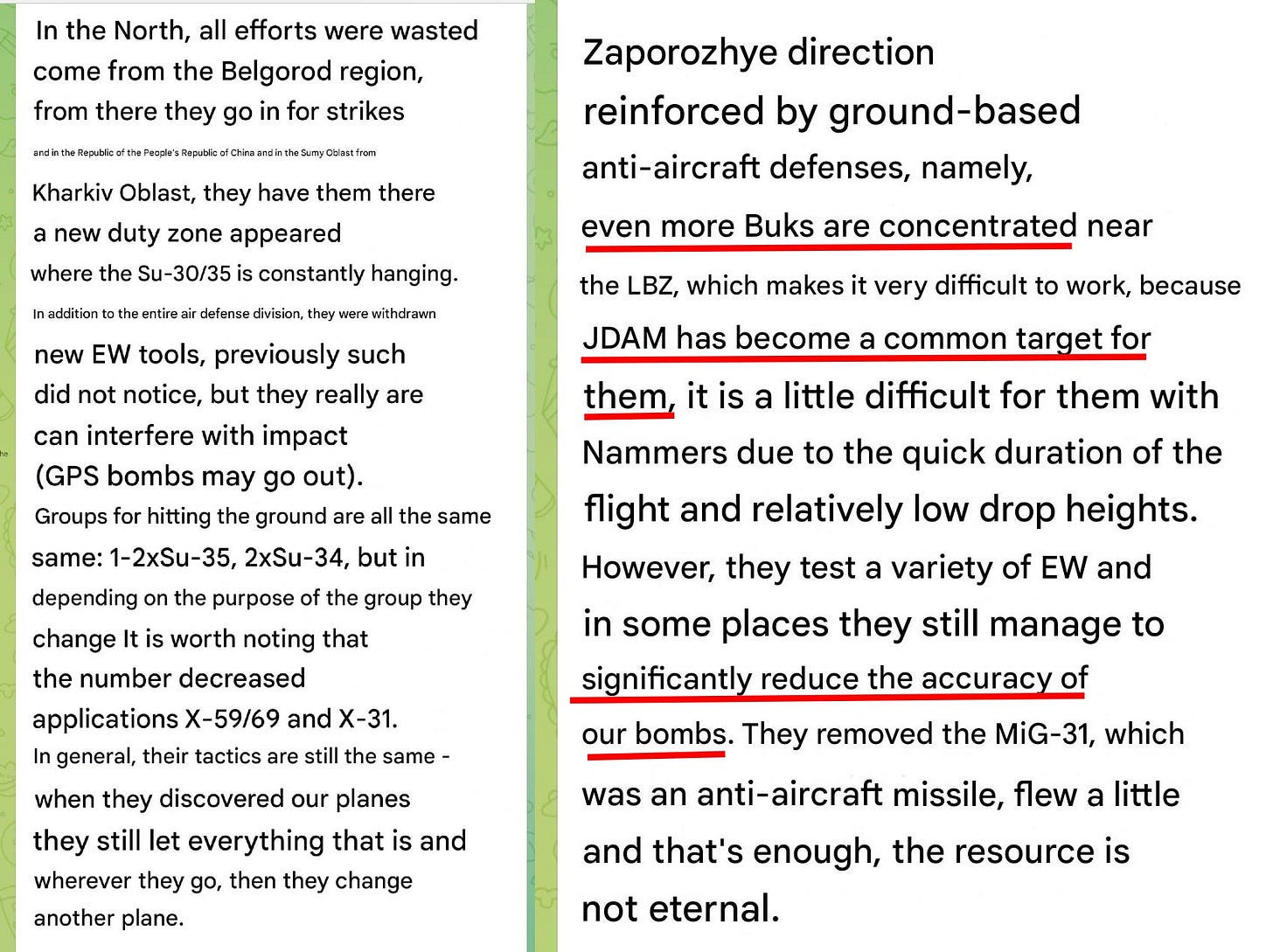 Ukrainian aviation channel complains that Russian Buks have learned to shoot down their JDAMs, with French AASM Hammers faring slightly better due to their lower drop heights. Meanwhile, Russian EW continues to paralyze the accuracy of their bombs: