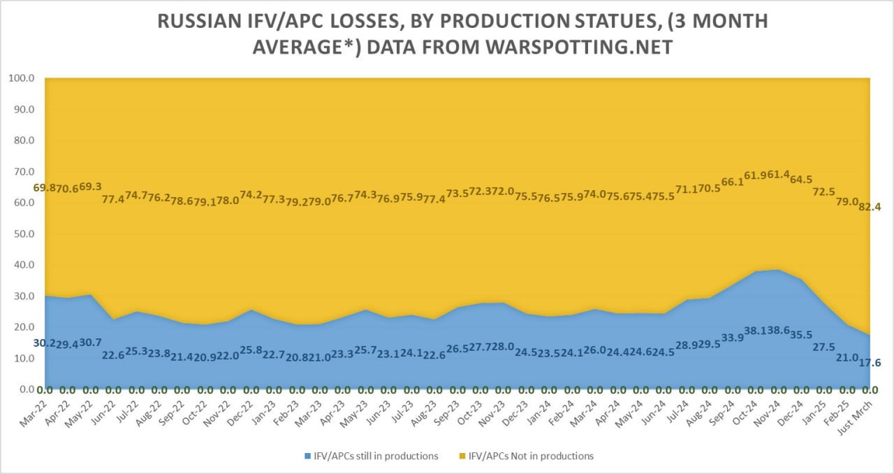 There has been increasing discussion surrounding suggestions that Russia may be in a stage of stockpiling its better and newer equipment for some future offensive, or perhaps for a potential NATO clash. This was emphasized by another chart showing that current in-production IFVs—which essentially amounts to BMP-3s—have been dipping in proportional losses, while older BMPs take their place: