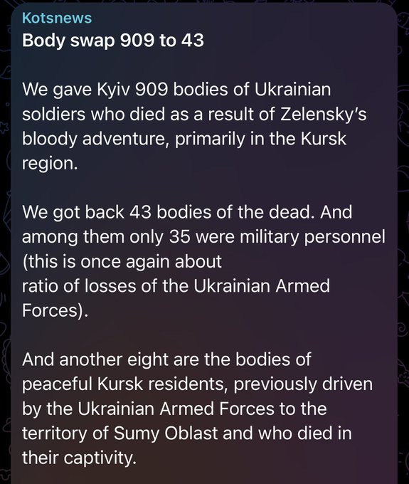 As jarring as the disparity might seem, I obviously do not realistically think the KIA ratio is quite that lopsided in reality, but I’m simply reporting the facts as they are. The exchange of bodies shows an incredibly lopsided record—justify it however you’d like for yourself. As usual, there’ll be the claims of “Russians are moving forward so they pick up more bodies”, and as usual I counter with: “Russians are moving forward because they’re killing more Ukrainians, forcing the AFU to retreat.” If AFU was winning and killing more Russians, then Russians wouldn’t be “moving forward.” If you’ve been watching the Kursk footage you’d know how bad the kill ratio is up there—virtual mountains of AFU corpses are littering every street.