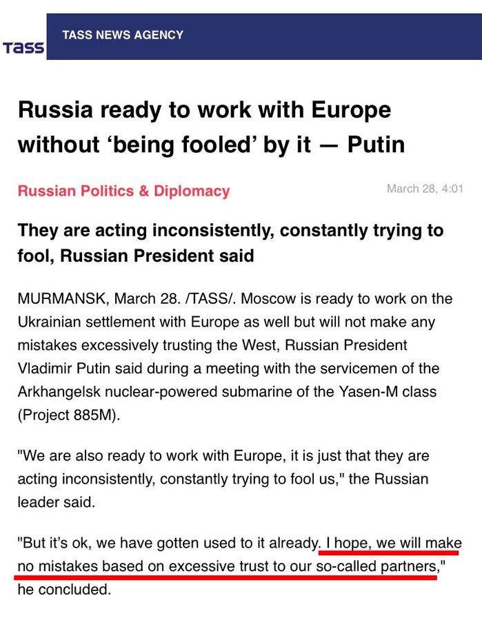 By the way, it’s worth noting the strange contradiction in the above statement, which reflects the wider narrative coming from the West. Zelensky here claims that Russia is trying to “buy time”—i.e. draw out the ‘negotiations’ in order to continue the war. But this is odd: wasn’t it Russia, according to Zelensky and the West, that is on its knees and badly needs a ceasefire to replenish? Why would Russia now be intent on doing anything it can to stop negotiations and in fact continue the conflict?