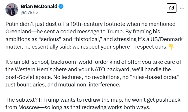 Putin has now declared that what the US does with Greenland is their business, with many viewing this as a ‘winking’ quid-pro-quo nudge implying Russia will turn a blind eye to the acquisition if US allows Russia to do what it must in Ukraine for its own security reasons.
