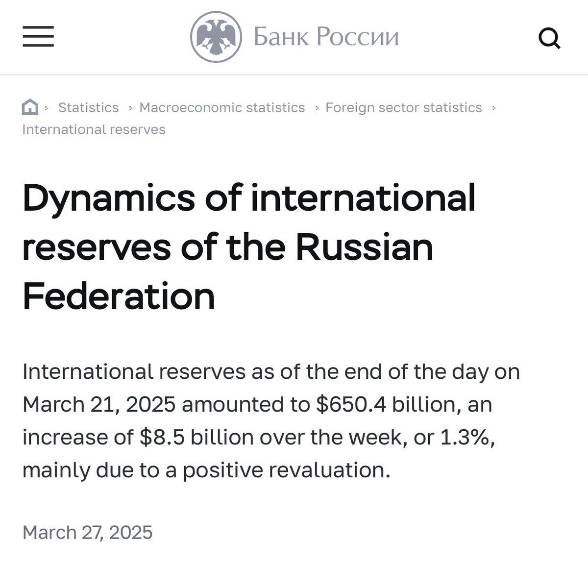 Amidst news of Russian ‘economic demise’, Russian international reserves reportedly increased by $8.5 billion this week, according to the Bank of Russia: