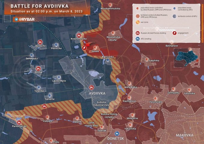 As can be seen by this best map, Russian forces appear to be slowly working toward an envelopment / boiler around Avdeevka. Huge progress is not to be necessarily expected here yet, as this area has the oldest and deepest fortifications as the frontline here has not moved since 2014. Several interviews with Russian commanders attest to the area being covered with reinforced-concrete fortifications, huge underground tunnels/depots/stockpiles, and extremely fortified trenches.