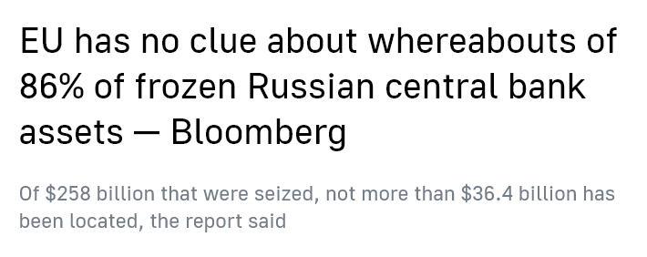 But now, a recent rash of corroborating reports has hit the wires that confirm the validity of Medvedev’s statement. Bloomberg published (and quickly retracted, most likely due to internal blowback) a piece grudgingly bemoaning that they in fact can’t find these so-called ‘seized Russian funds.’