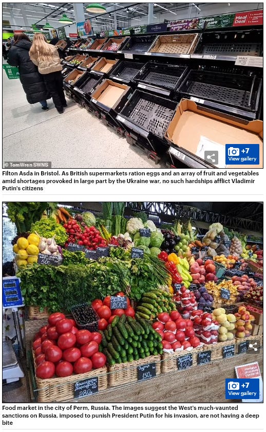 Yesterday’s DailyMail article whinged about how British citizens are forced to ration their food amid unprecedentedly empty supermarket shelves, while equivalent Russian cities are ‘groaning beneath the weight’ of their bountiful food surpluses.