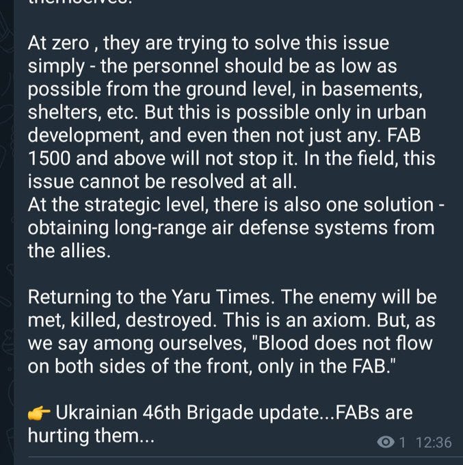And another from the AFU 46th Brigade. Read carefully about what glide-bomb Fabs are doing: