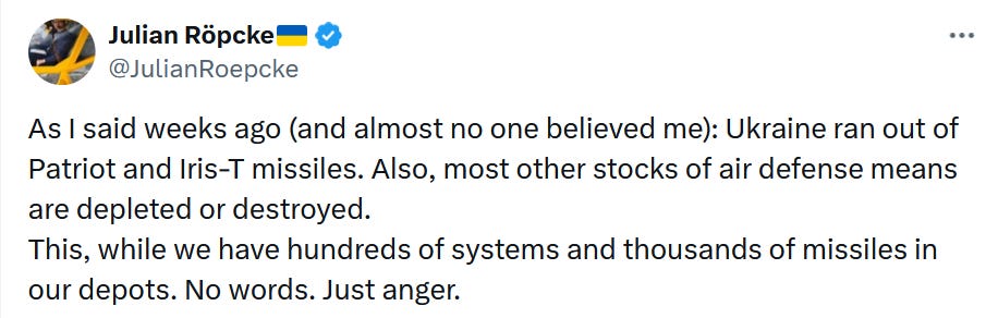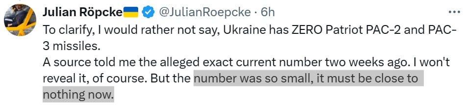 In fact, Bild’s Roepcke appears to claim that Ukraine has completely run out of the flagship AD missiles: