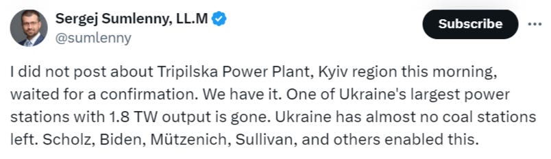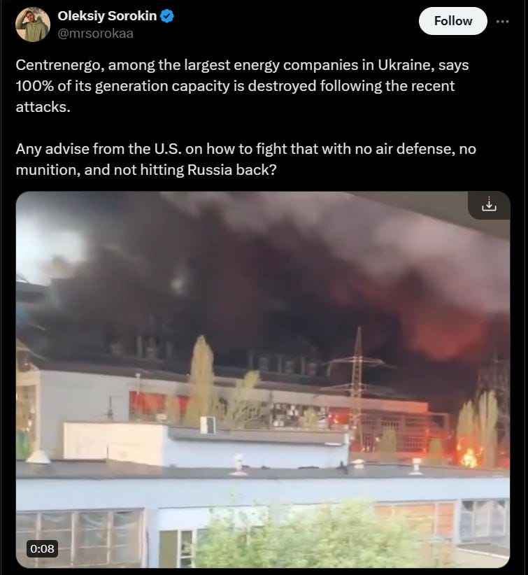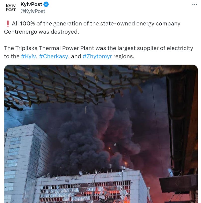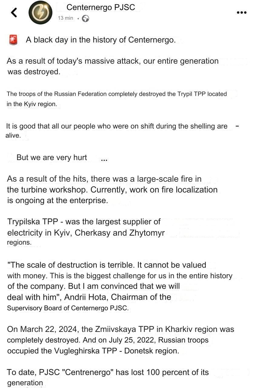 Here’s Ukraine’s own Centernergo energy concern declaring it to be the worst day in their history, as the Trypil Thermal Power Plant in the Kiev region was wiped out: