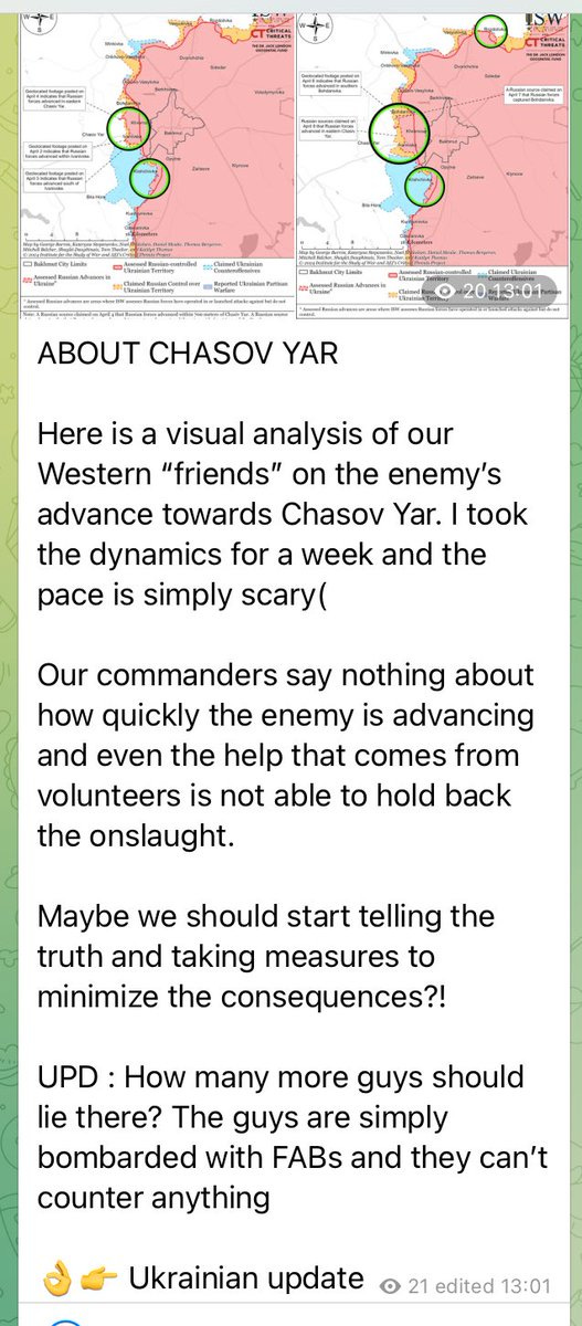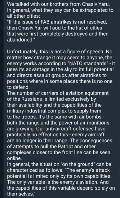 I wrote this on X, but I’ll say it here again as a final point. Now that Russia is mass-producing heavy glide-bombs, there is almost no possible way for Ukraine to hold ground. Only in places like Avdeevka, with massive fortified underground structures, were they able to withstand the onslaught. But nearly everywhere else that’s left, such as Chasov-Yar now, glide-bombs will wreck top-ground fortifications and trenches, crumpling them even from some distance away. Ukrainians have reported that the Fab-500 rips doors off hinges from 1km away. There is simply no way to hold trenches when the Fabs start arriving on top of them. And as of this writing, there’s said to be a massive Kab/Fab assault on Chasov Yar ongoing. Here’s what it looks like over the city: