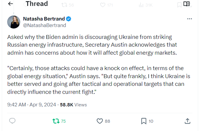 This is clearly either not right, or misunderstood. I already explained how hitting Russian refineries doesn’t really affect global oil as refineries are working to refine gasoline for Russia’s domestic use. The real reason Biden’s admin is worried about “global” markets is because of the implicit threat of Russia’s retaliation. There are obviously backdoor deals wherein Russia has made clear its escalatory regime should Ukraine be abetted by NATO in striking certain critical ‘red line’ facilities.
