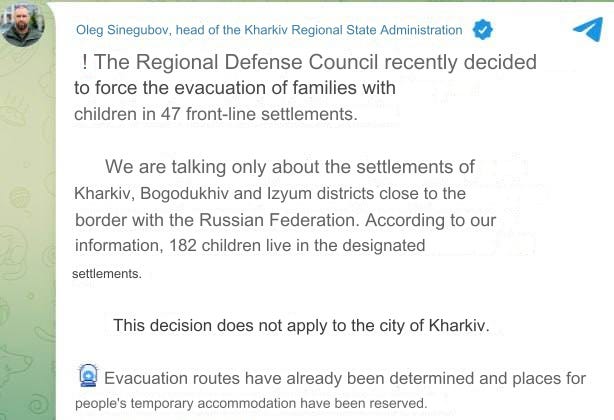 So, to dress the table, here’s head of the Kharkov administration announcing they’ve made their decision on evacuating nearly 50 settlements and villages in the north Kharkov region close to the Russian border: