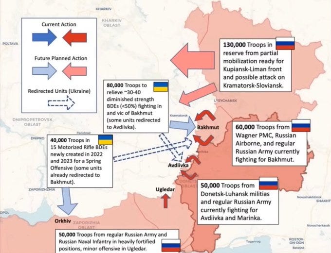 The 120k number matches almost precisely with the number of troops Russia has been designating for each given sector or front. For instance, the Kupyansk-Kremennaya theater was said to have about 120-150k men. The Zaporozhye theater was said to have roughly that amount as well; and then the Donetsk also. Most of that information is compiled from various sources such as the Pentagon leaks, which gave Russian troop dispositions. But as an example, here’s an older out of date graphic I happened to find in my collection just to give a rough idea: