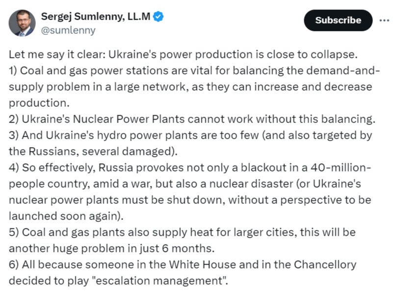 The day starts with a massive Russian missile strike that has wiped out another chunk of the remaining Ukrainian energy capacity. It’s now confirmed that Russia is hitting precisely the turbine rooms causing long-lasting, if not permanent, damage.