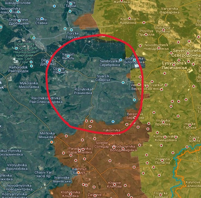 The last thing I wanted to talk about was to use Bakhmut to swing back around to the AFU offensive. But first let’s mention that I had already predicted way back in late last year, that after Bakhmut, Seversk would likely be next—not a direct assault westward to Chasiv Yar and Kramatorsk, etc.