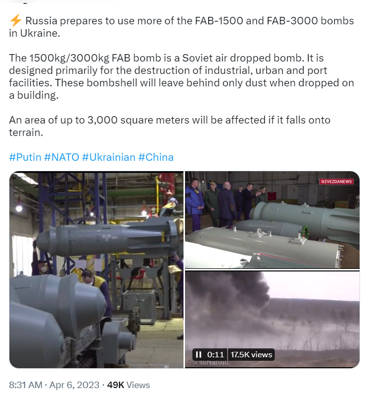 Well done. We are at the nexus of reality vs. Western spin narrative now. The crux in the road. The West was looking for a "photo op" smooth exit from this debacle, and it is slowly creeping into the NATO consciousness that this will indeed not happen. What will happen is surrender on Russian terms. That is a factual inevitability. It is written in stone now. In the tablets. What happens in Ukraine from now on will be 100% on Russian terms. We discussed previously that the Russian Air Force would play a decisive role in the ending of this conflict. Well, it seems it has already happened. I have not heard of the FAB 3000, but if this is indeed being dropped on Ukrainian postions it is lights out. The FAB 1500 by itself does massive damage. The Ukrainians can shoot their wad with their" spring offensive", but they will be anilhated. NATO is no match for the Russians in their backyard. The stupidy and arrogance of NATO is pursuing this conflict and escalating is epic in its scope. I say all of this with the understanding that Russia has restrained itself in the damage it has inflicted so as to avoid NATO going totally insane. Russia is fighting with 100% confidence , resolve and capacity to prevail. And it will prevail on its terms. We are at the beginning of the end now. Less than 6 months to go.