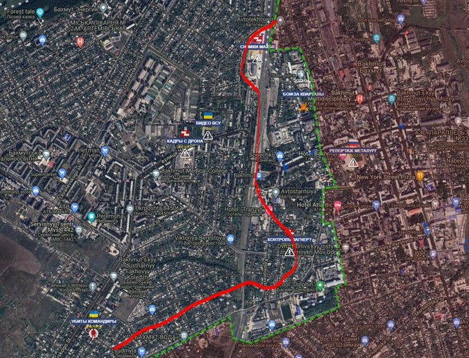 There have in fact been major advances. Most notably, Wagner has finally broken through the key ‘rail line’ which bisected western Bakhmut from north to south.