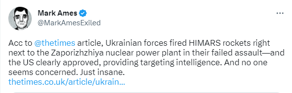 As can be seen in the second paragraph above, they even make a giant admission: that the AFU used HIMARS to strike Russian positions at the plant. Recall that it was earlier confirmed that the U.S. has to give greenlights for every single HIMARs target/usage through a permission chain. This is tacit proof that the U.S. was in fact complicit in the targeting of a nuclear power plant.