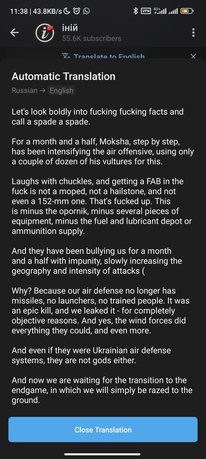 The translation is a little wonky but he’s basically saying Russia’s new guided bombs are not a moped (Geran/Shahed drone), not a “Hail” stone (Hail is the translation for ‘Grad’ MLRS), and not a 152mm artillery shell. In short, they are saying these new guided bombs are massively more powerful and are doing serious damage.