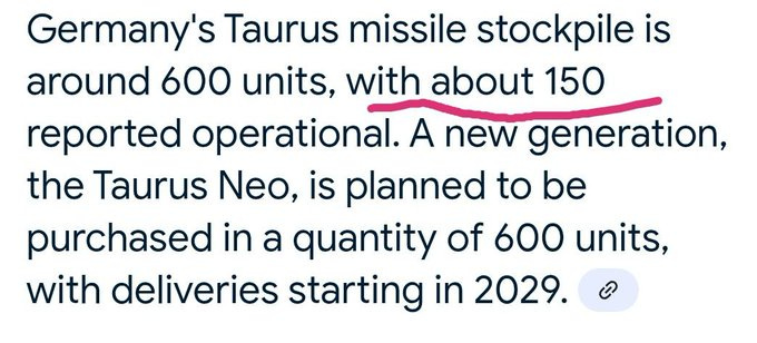 He goes on to demand the immediate delivery of 150 Taurus missiles, which, according to previous estimates, could be the total sum of operable stock in the entire German stockpile.