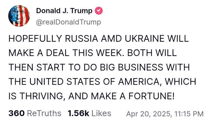 Trump puffed out a hastily-scratched-together missive that appears to capture his real intent on ending the war—a feast of corporate profiteering for everyone!