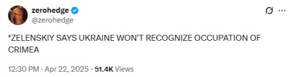 The peace push charade continues on like a kind of low-rent traveling circus, setting down its ramshackle tents in some new backwater hole each night. This week it’s word that Trump is pushing Ukraine to acknowledge—at minimum—Crimea as Russian, with Ukraine reportedly ready to “de facto” give up all current Russian-controlled territories: