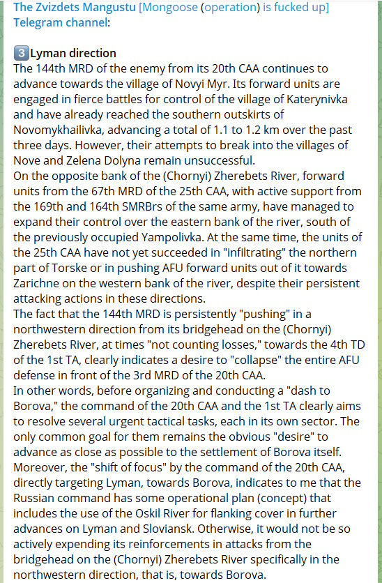 A write up from a Russian military channel with more details as to the units operating on this front. It was written about a week or two ago before Nove was captured, so it’s slightly out of date but gives good unit descriptions for those interested in following along: