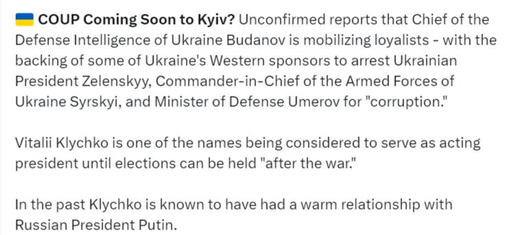 Interestingly, this almost exactly coincides with the May 21st deadline to Zelensky’s legitimacy, after which there are fears things may become quite a free for all. In fact, rumors on this tack already abound, like the following—though take it with a massive grain of salt, as it’s most likely fake but meant more as a demonstrative sample of the brewing troubles: