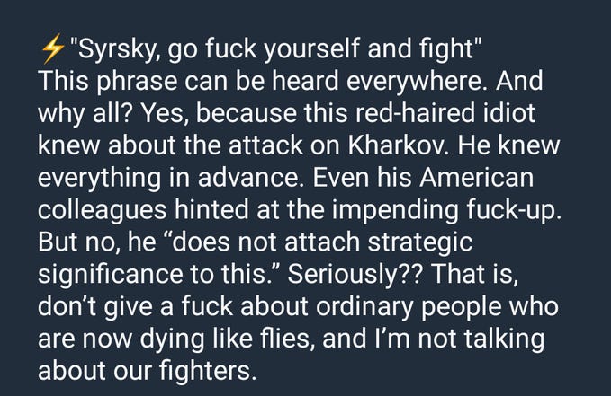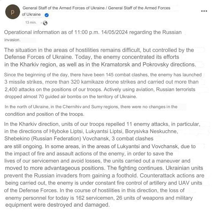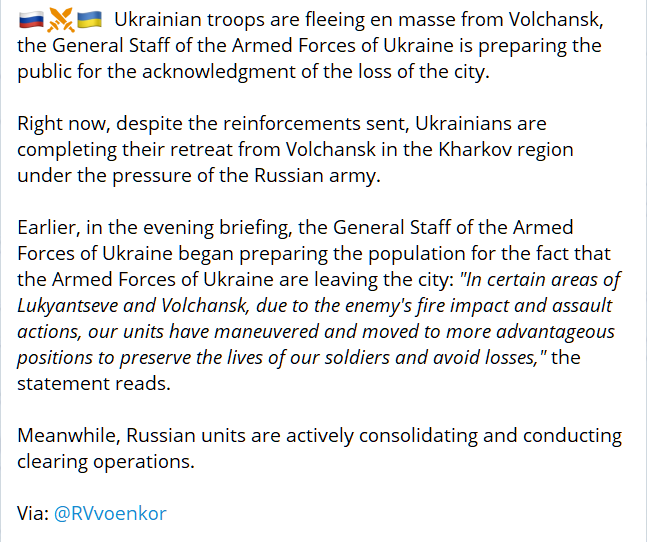 As of this writing, the Ukrainian General Staff has announced a withdrawal of Volchansk, the largest city and stronghold of northern Kharkov region, though it’s unclear as of yet if it’s a full or partial one, as the wording is ambiguous: