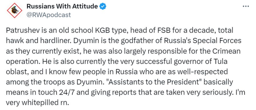 As for Russia, I think that it's clear from Putin and his appointments that he is setting the stage for a future Russia beyond the SMO. He wants to make sure that Russia wins not just the SMO, but the peace after.