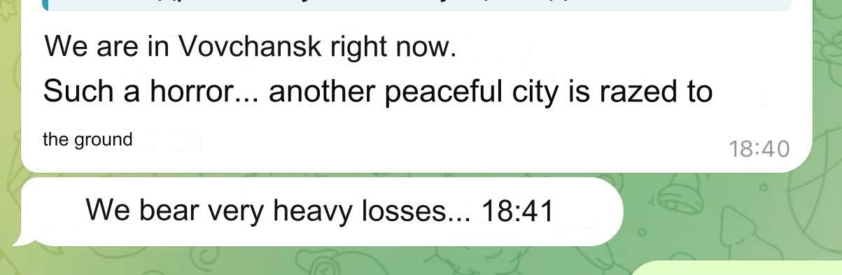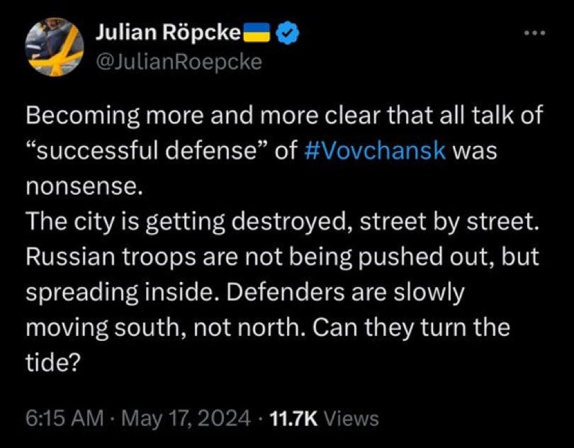 By the latest maps, Volchansk appears something like 40-50% taken, with Russian forces said to have begun crossing the Vovcha river which runs through its center: