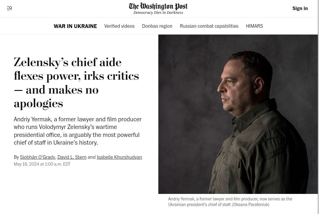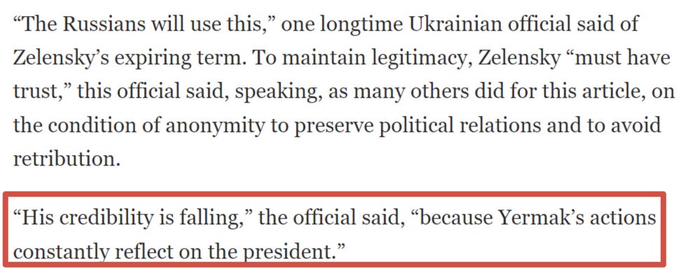 That’s right: Washington Post is now openly revealing Yermak as the shadow hand who secretly runs Ukraine. But more than that, by doing so they are calling into question Zelensky’s true power and legitimacy, in effect undermining him. Why would WaPo at this exact time, merely days before Zelensky’s presidency is supposed to run out, write things like this: