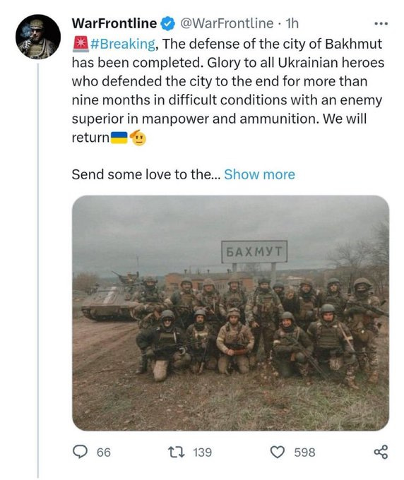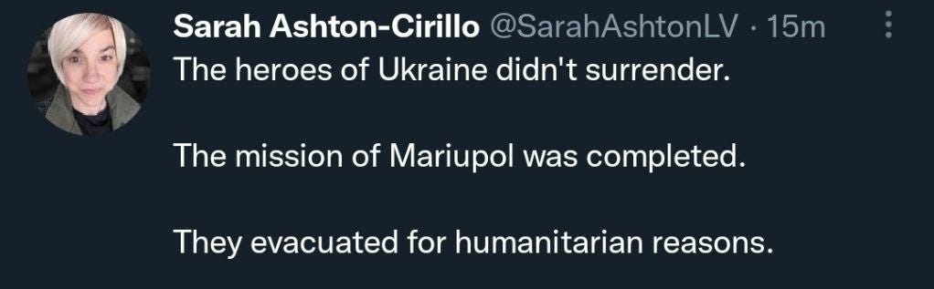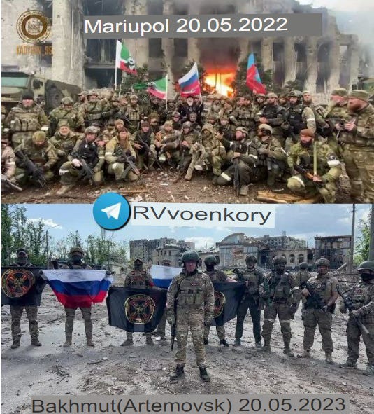 Bakhmut today has fallen on the exact one year anniversary of the fall of Mariupol on May 20th, 2022. And not surprisingly, the posture adopted by the UA supporters is the same exact energy as before: cringe, cope, excuse-making. “Bakhmut’s mission is accomplished,” they say, swallowing sobs.