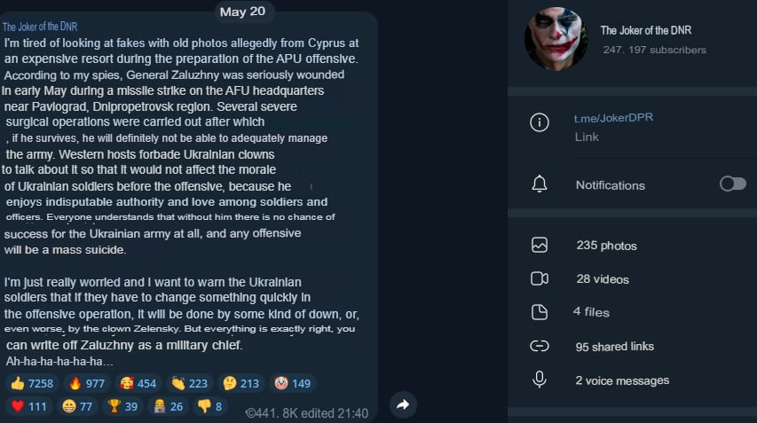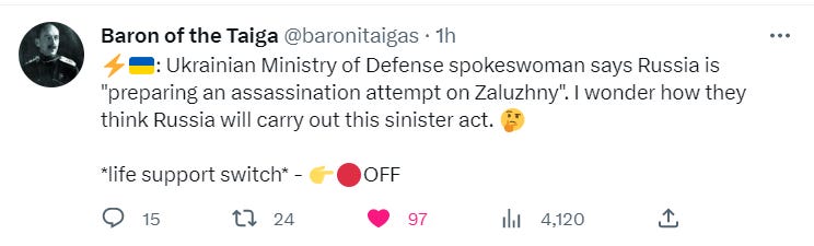 Update: There even now appears news from a Ukrainian MOD spokeswoman that ‘Russia is preparing an assassination attempt on Zaluzhny’. If this is true, it’s clear that he probably is going to be unplugged in the near future, and they are just setting the ground for the announcement of his death.
