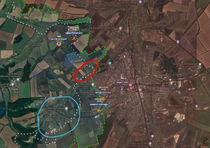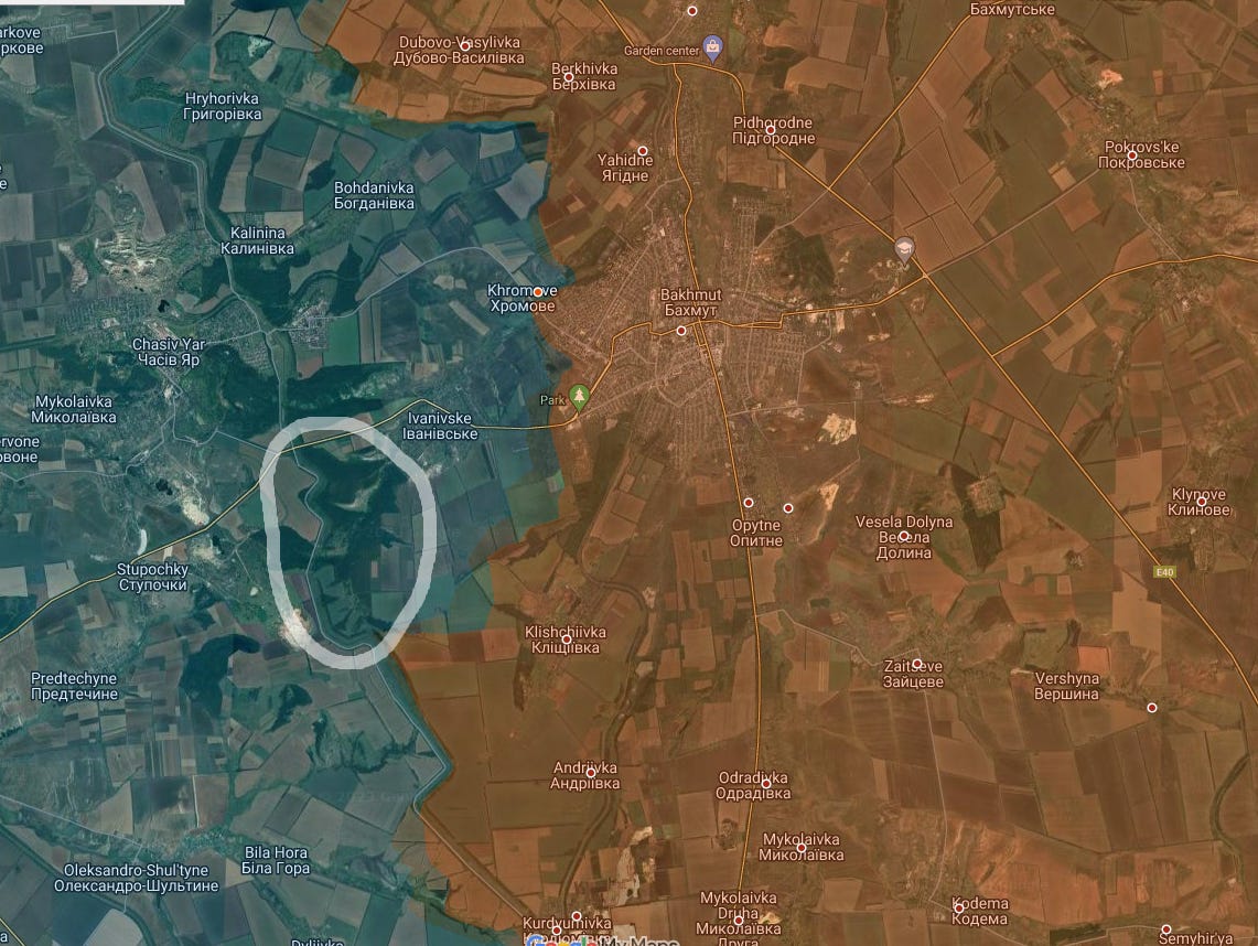 Khromove in red above, Ivanovske/Krasnoye in blue. The big problem with Ivanovske is the huge forest belt on its flanks which has proved a major challenge for Wagner forces previously. In order to approach the suburb, you’re forced to take raking fire from well dug-in Ukrainian positions inside the forest. And they’re difficult to root out because under the forest cover, it’s hard to conduct accurate ISR to hit them as they are well concealed inside the forest. The only way is to root them out by hand by assaulting the forest itself, but to do so, you have to cross open fields from which you take massive fire from their positions. Forest seen below circled in white, with Ivanovske to its right/northeast.