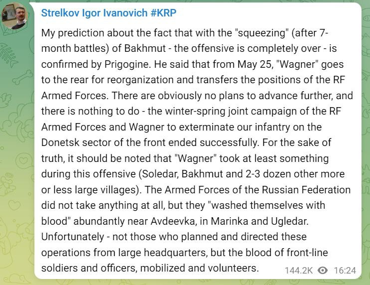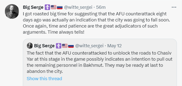 correctly saw what was happening:Meanwhile, don’t forget that the 2D Bloggers’ favorite mouthpiece, Strelkov, in fact predicted that Russia would not capture Bakhmut. Then he changed it to Russia would not hold Bakhmut after winter, Ukraine would definitely recapture it from an ‘exhausted’ Russian force: