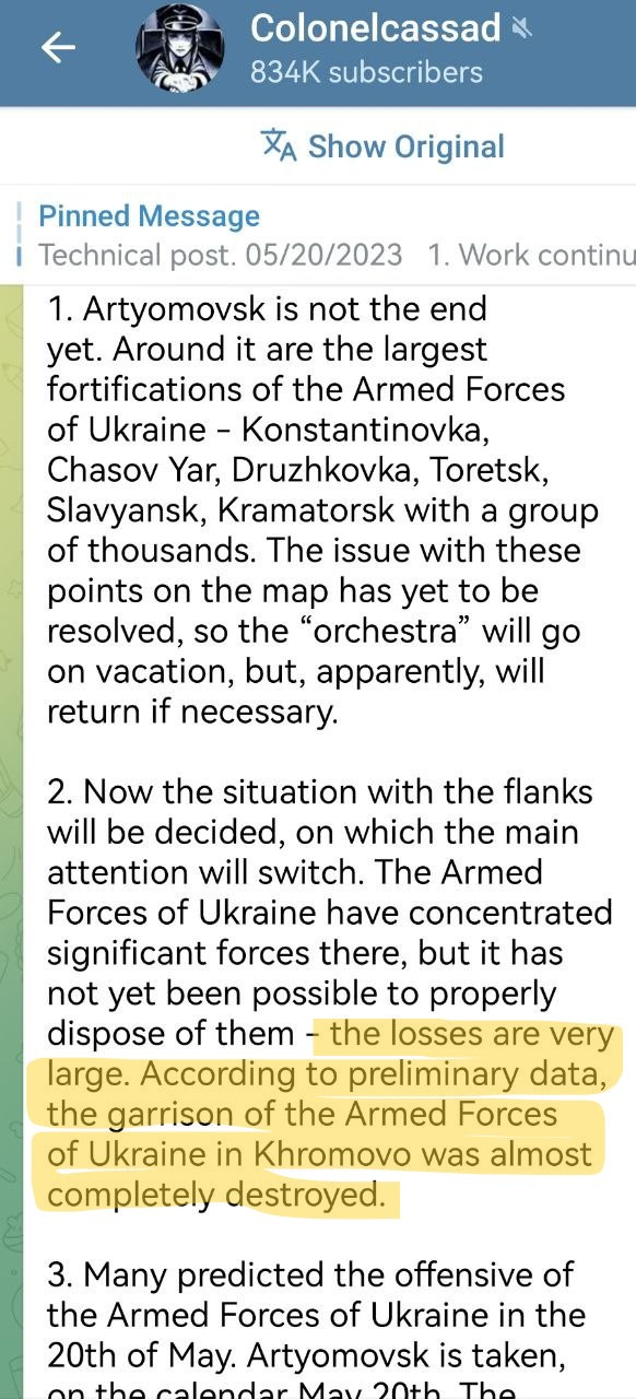 Also ColonelCassad reports large losses for AFU there, with a garrison in Khromove being ‘completely destroyed’: