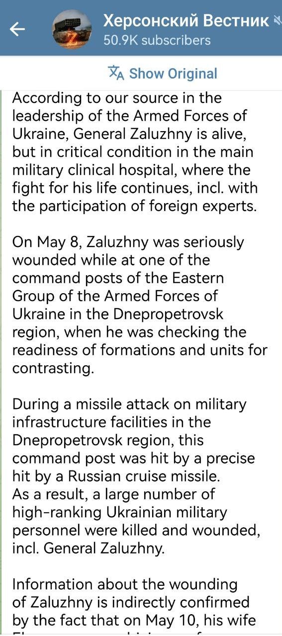 Here, Prigozhin rather humorously recounts his version of what happened to Zaluzhny. He states that on May 11, 12, and 13, Zaluzhny was in fact within Wagner’s striking range, and that Wagner did in fact carry out ‘certain tasks’ toward that count. But he does not know how successful those ‘tasks’ were. More and more it’s starting to seem like perhaps something did happen to him.