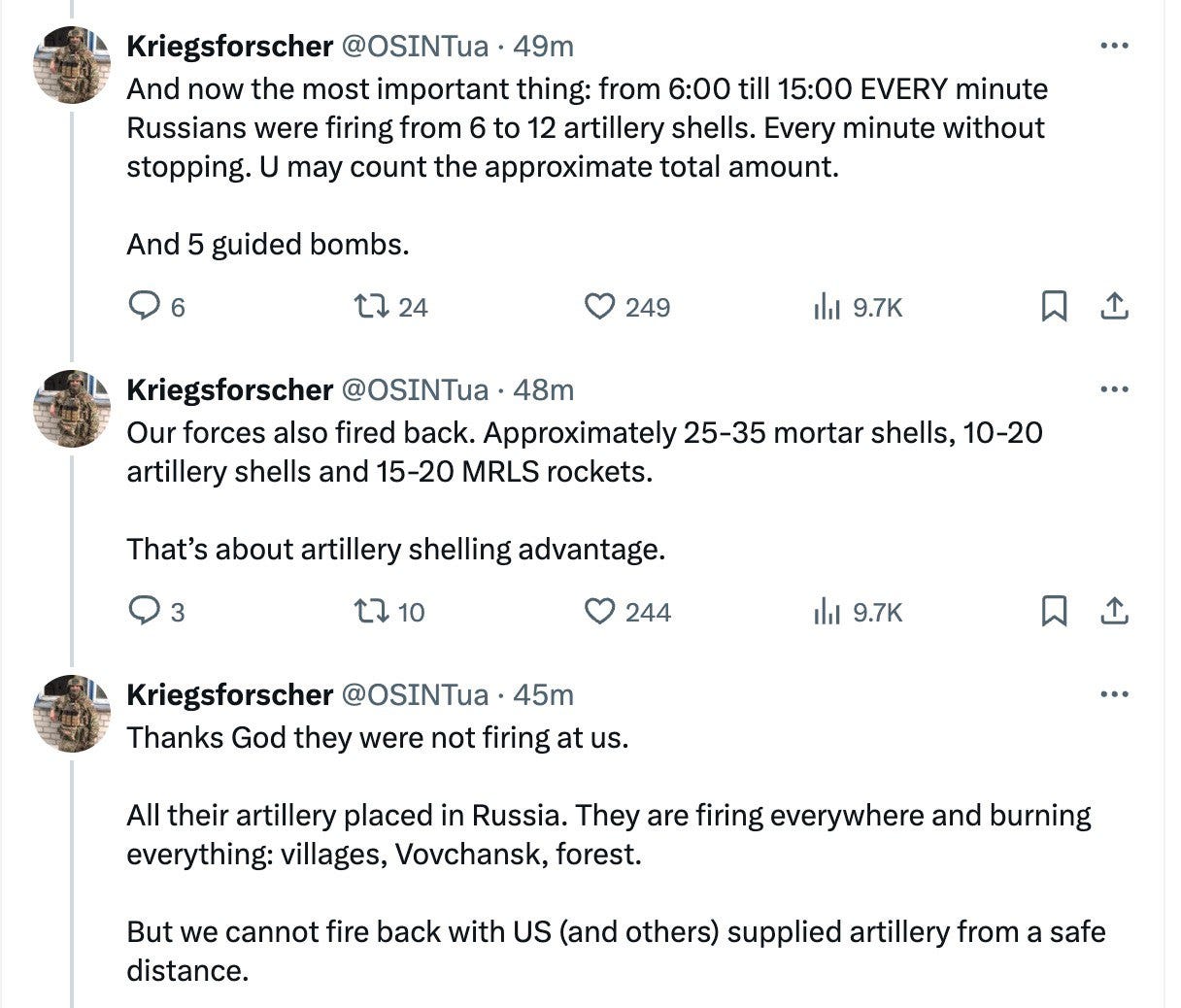 Using the median of 9 shells per minute, 60 minutes x 9 hours = 4,860 shells per day fired just on the Volchansk front alone.
