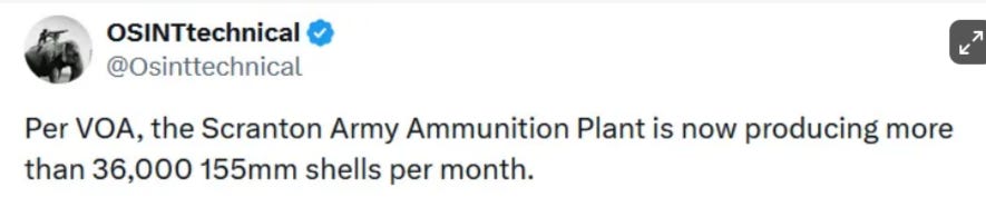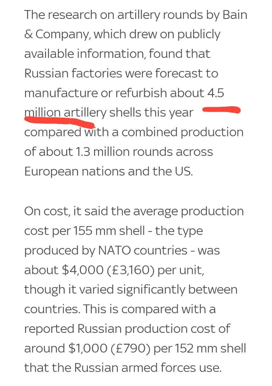 So, they claim Russia is now or soon to be doing 4.5M shells per year, which is 375,000 a month, which further allows the firing of 12,500 per day. Recall the U.S. recently celebrated achieving 36,000 per month production: